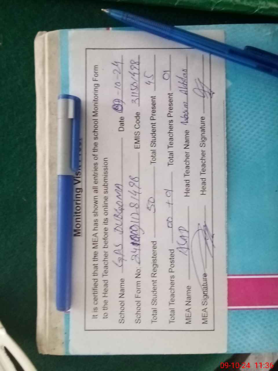 | Attendance Register | Head Teacher | MEA with School | Visit Proof |