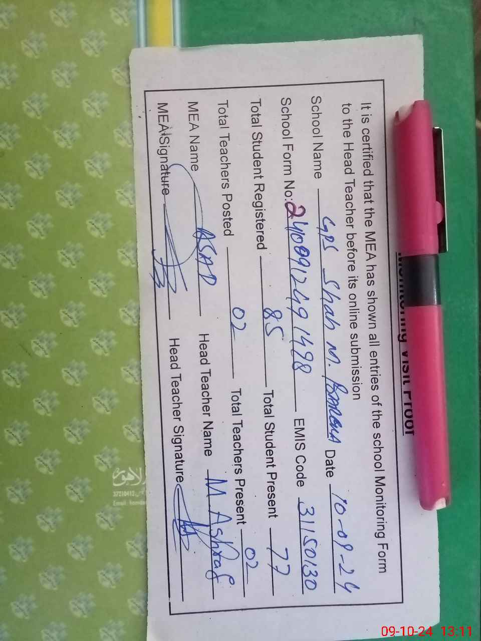 | Name: MU**** AS**** Designation: (School Headmaster's/Headmistress's) PST Phone/Cell Number: 03**** |