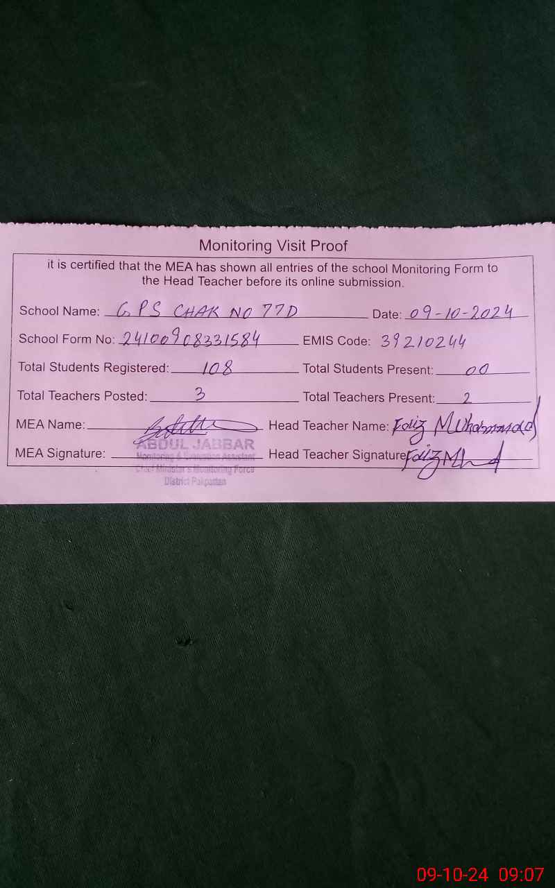 | EMIS Code: 39210244 | Name of School: GPS CHAK NO. 77 /D | |||
