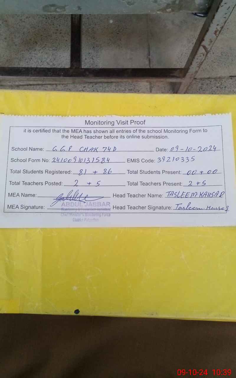 | EMIS Code: 39210335 | Name of School: GGPS CHAK 74/D | |||