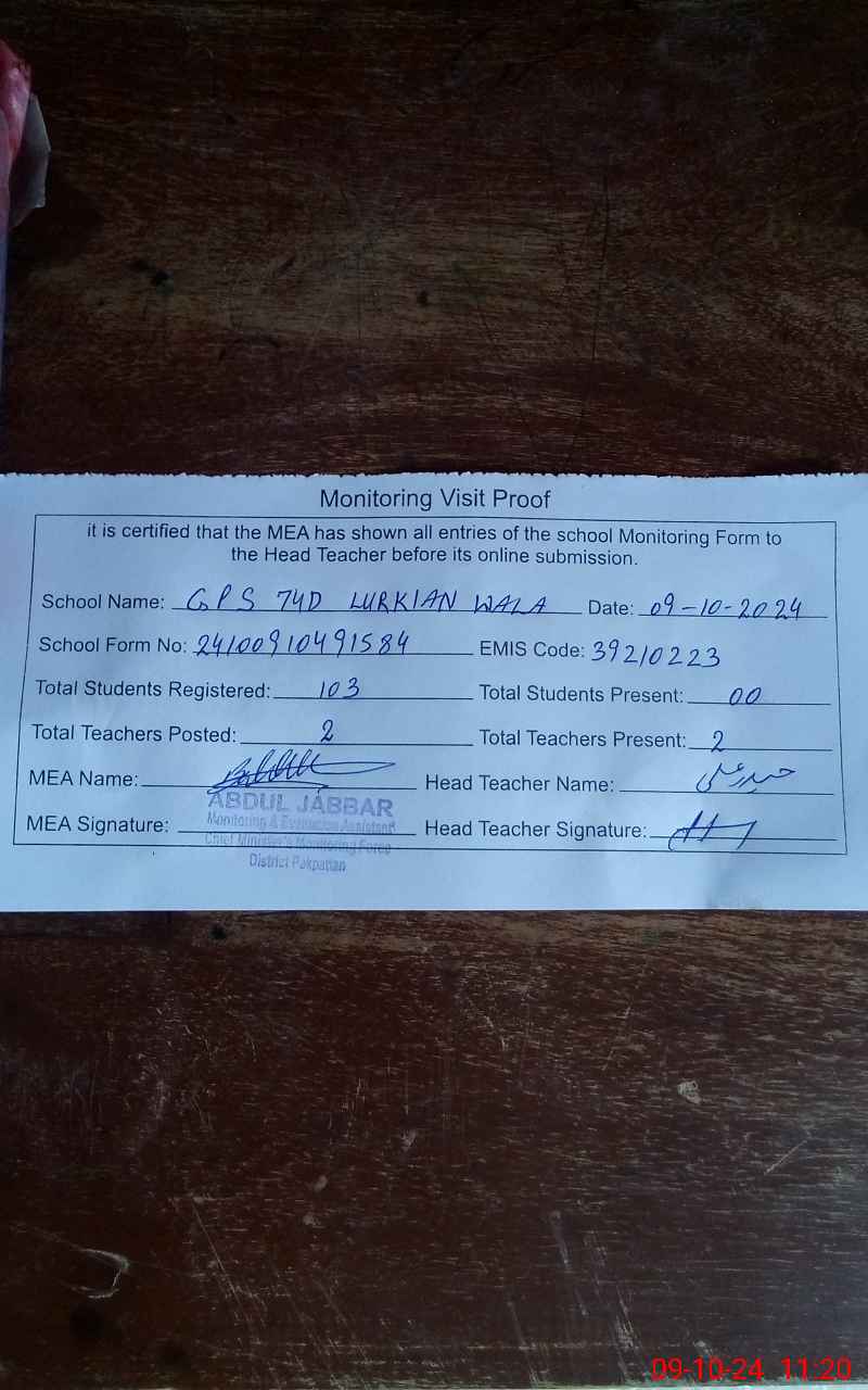 | EMIS Code: 39210223 | Name of School: GPS 74 D LURKIAN WALA | |||