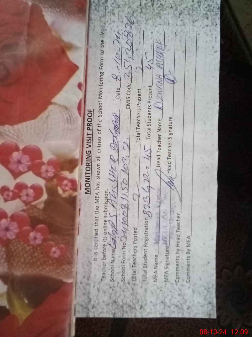 | Attendance Register | Head Teacher | MEA with School | Visit Proof |