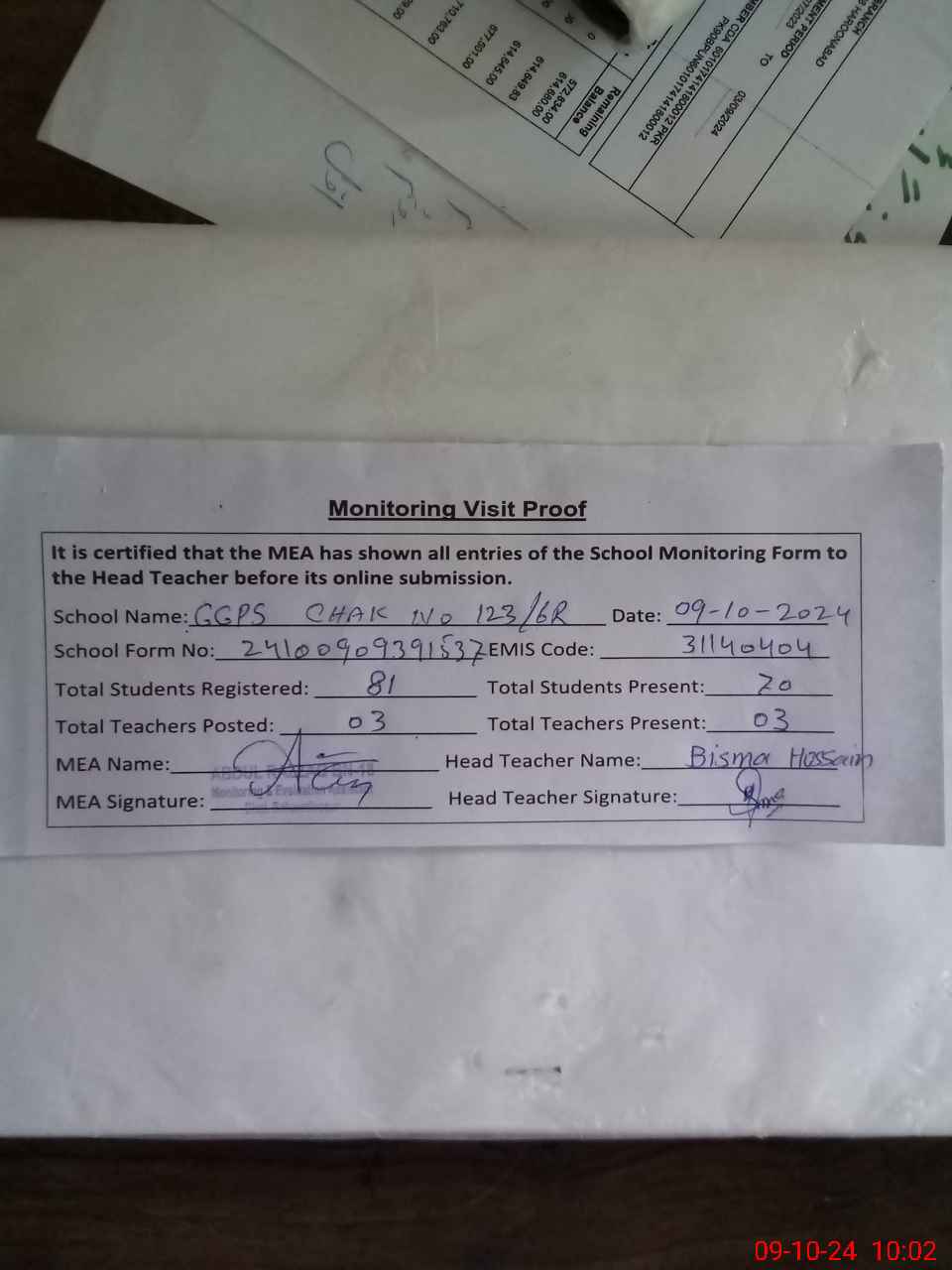 | Attendance Register | Head Teacher | MEA with School | Visit Proof |