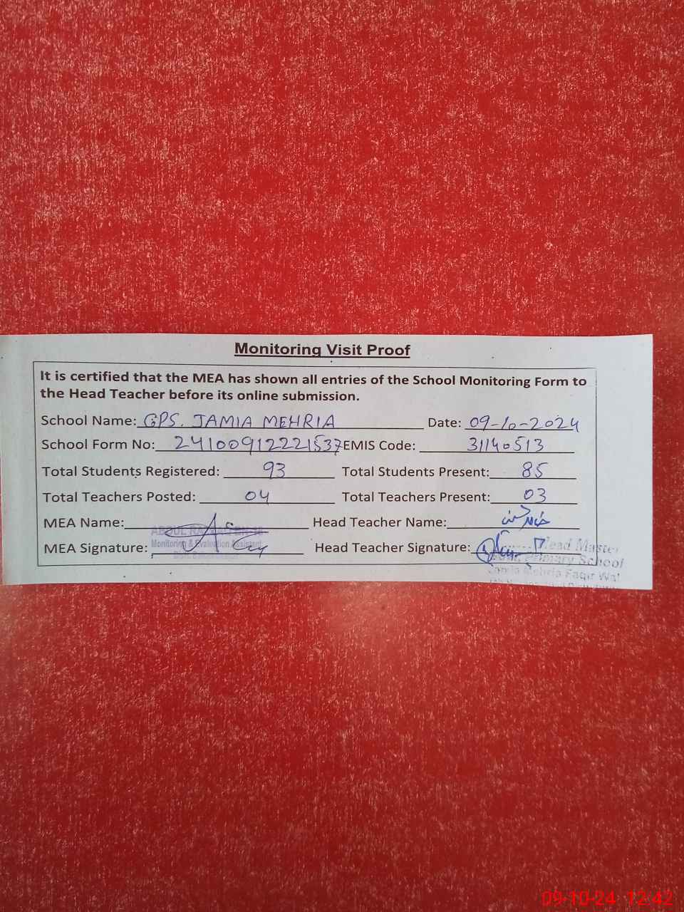 | Attendance Register | Head Teacher | MEA with School | Visit Proof |