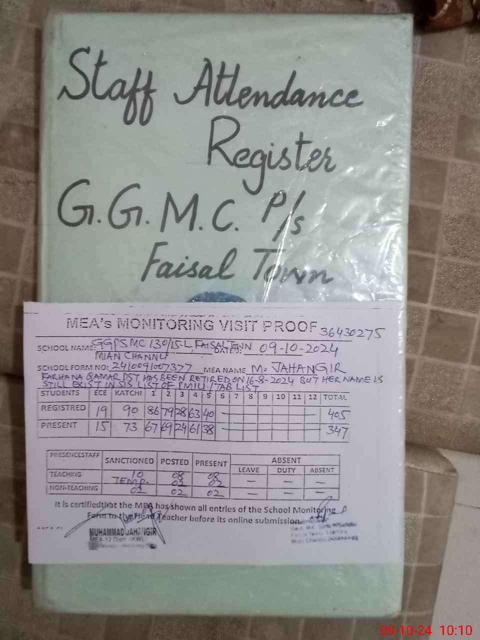 | EMIS Code: 36430275 | Name of School: GGPS MC 130/15-L FAISAL TOWN, MIAN CHANNU | |||