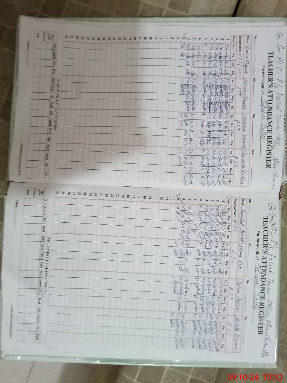 | Remarks (Use Separate Page if Required): FARHANA QAMAR PST HAS BEEN RETIRED FROM SERVICE ON 16 AUGUST 2024 BUT HER NAME IS STILL EXIST IN SIS LIST OF PMIU TAB LIST SIDRA RASHEED PST IS ON TEMPORARY DUTY NEED BASE OR TILL THE COMPLETION OF ASSIGNMENT FROM GGPS BAGHDAD NO 2 TO THIS SCHOOL WEF 09 SEPTEMBER 2023 TO TILL TIME TO TIME SABA ASGHAR EST SC IS ALSO ON TEMPORARY DUTY NEED BASE OR TILL THE COMPLETION OF ASSIGNMENT FROM GGES 54 15L MIAN CHANNU TO THIS SCHOOL WEF 08 OCTOBER 2024 TO 07 NOVEMBER 2024 FOR ONE MONTH BOTH ORDERS ARE SIGNED BY ASSTT DIRECTOR ADMIN KHANEWAL ON BEHALF OF CEO DEA KHANEWAL FTF RECORDS ARE NOT MAINTAINED WASH CLUB RECORDS ARE NOT AVAILABLE LESSON PLANS ARE NOT AVAILABLE RANDOM CLASS KATCHI IS NOW IN CLASS TWO AND THREE | |||||