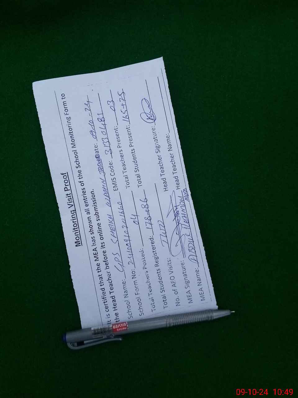 | Certified that this School was Inspected by the Undersigned MEA/DMO Today and the Information Stated Above is as Per Record. | |||||