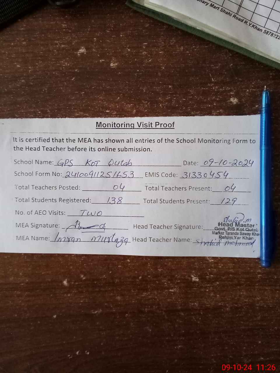 | EMIS Code: 31330454 | Name of School: GPS KOT QUATAB | |||