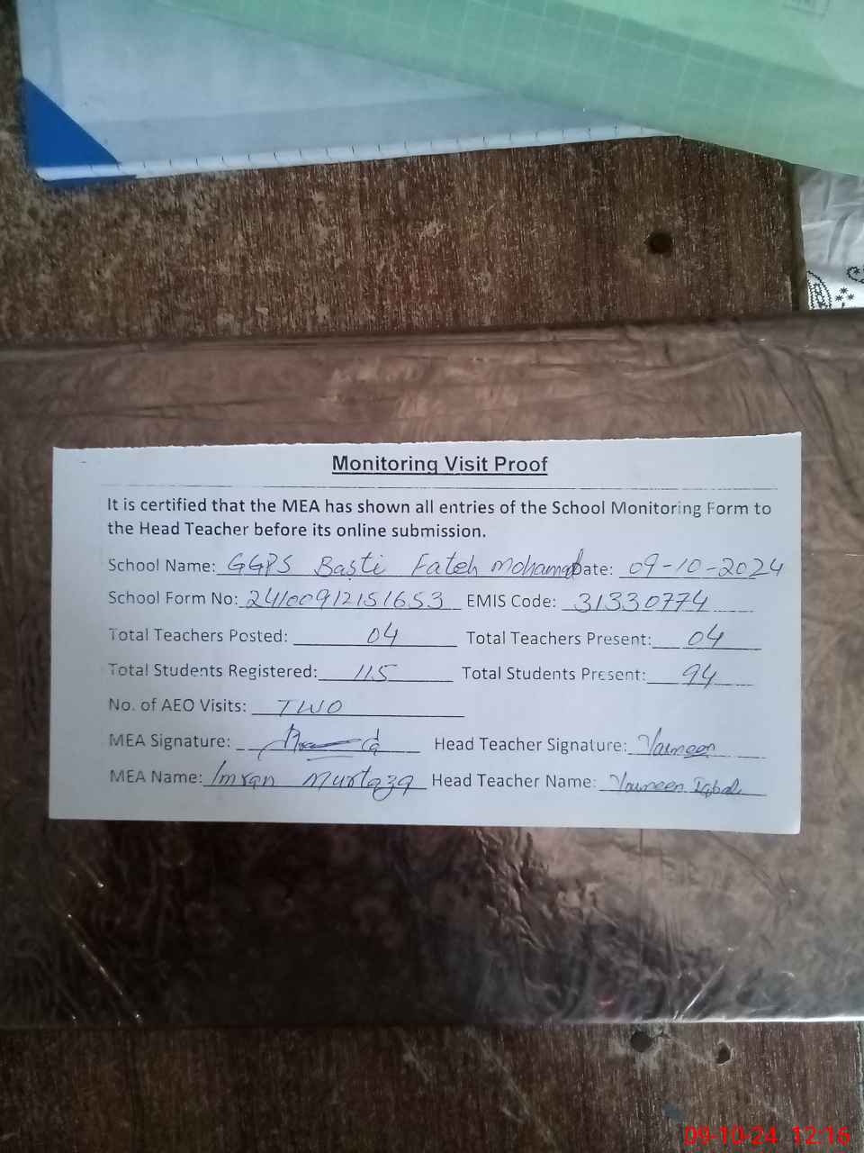 | Certified that this School was Inspected by the Undersigned MEA/DMO Today and the Information Stated Above is as Per Record. | |||||