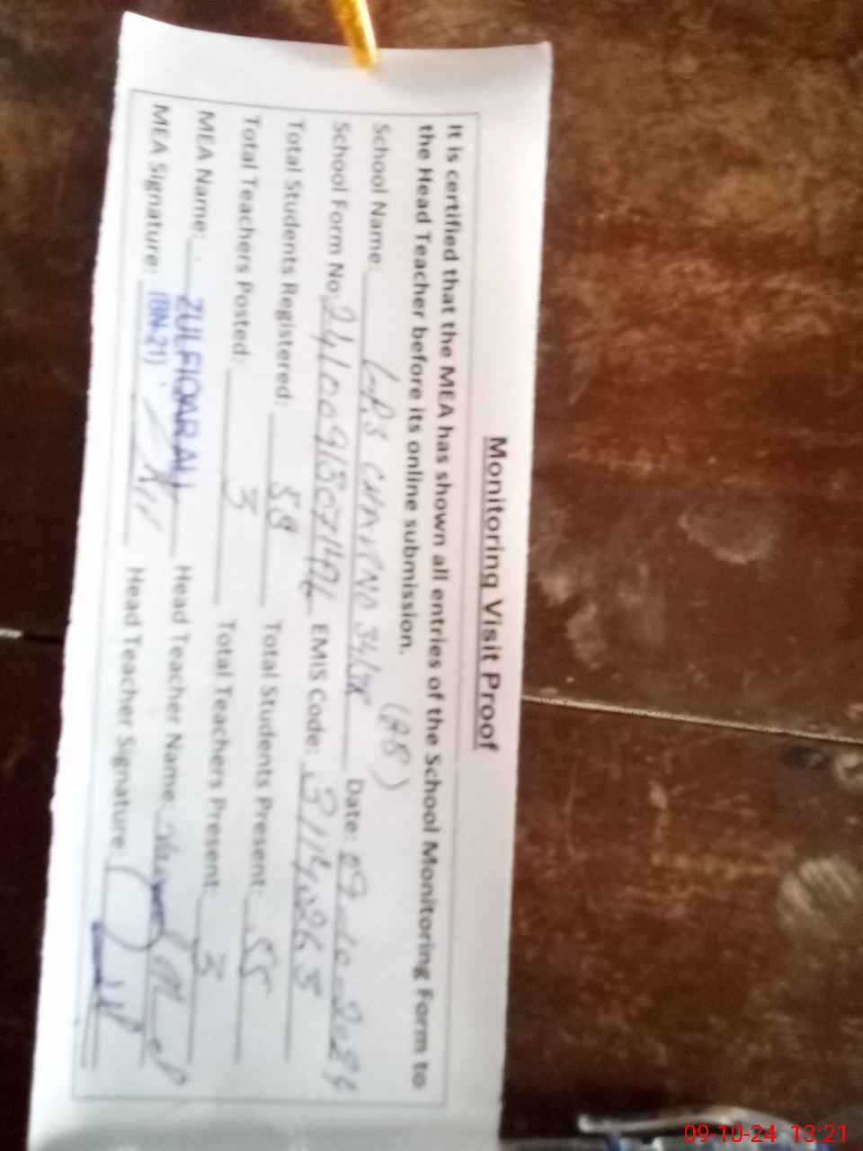 | Attendance Register | Head Teacher | MEA with School | Visit Proof |