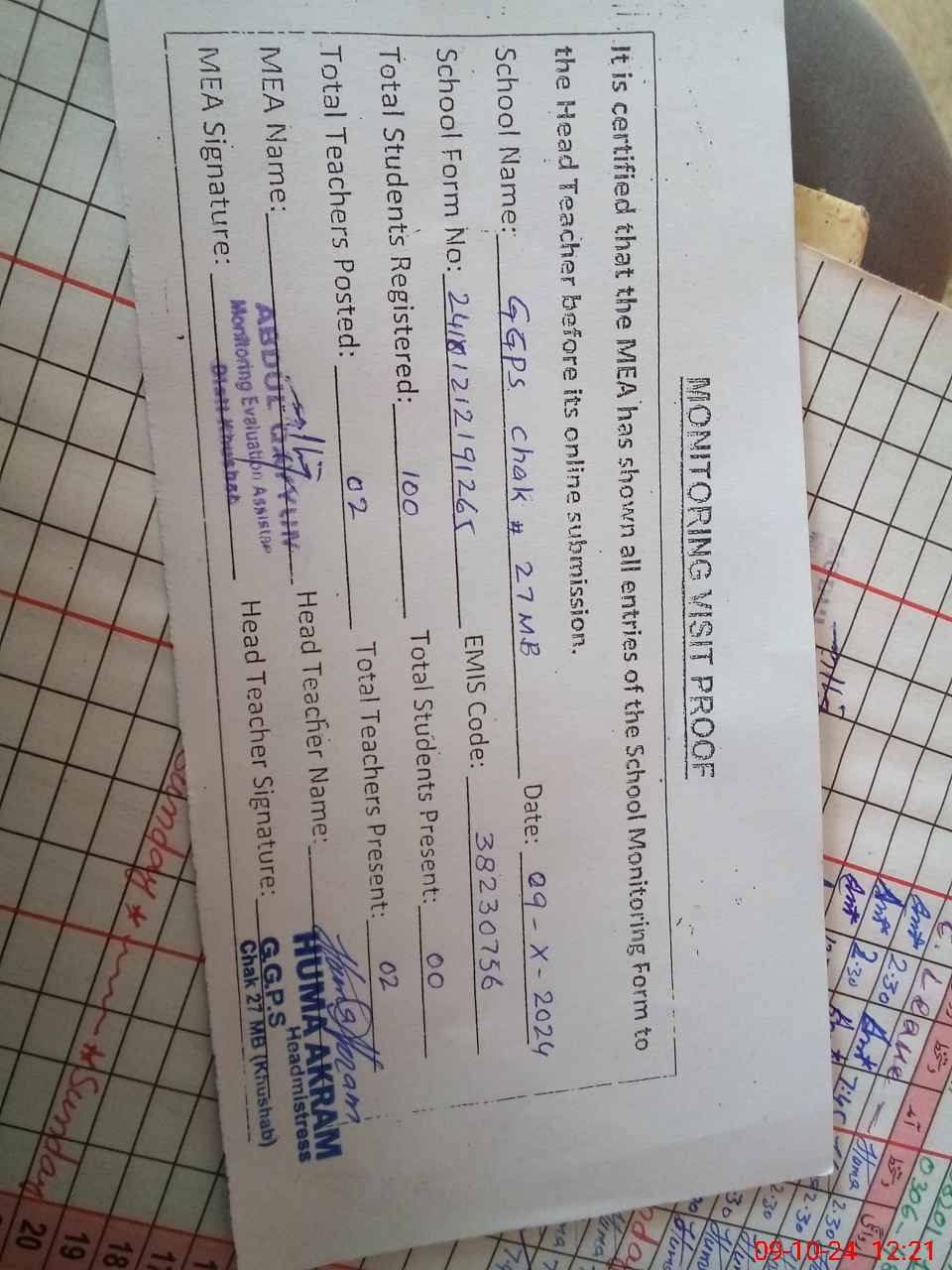 | Attendance Register | Head Teacher | MEA with School | Visit Proof |