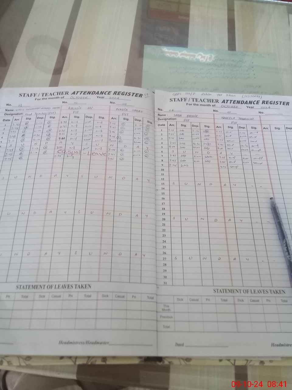 | CNIC | Full Name | Designation | R/C | Absence During Last Calender Month |