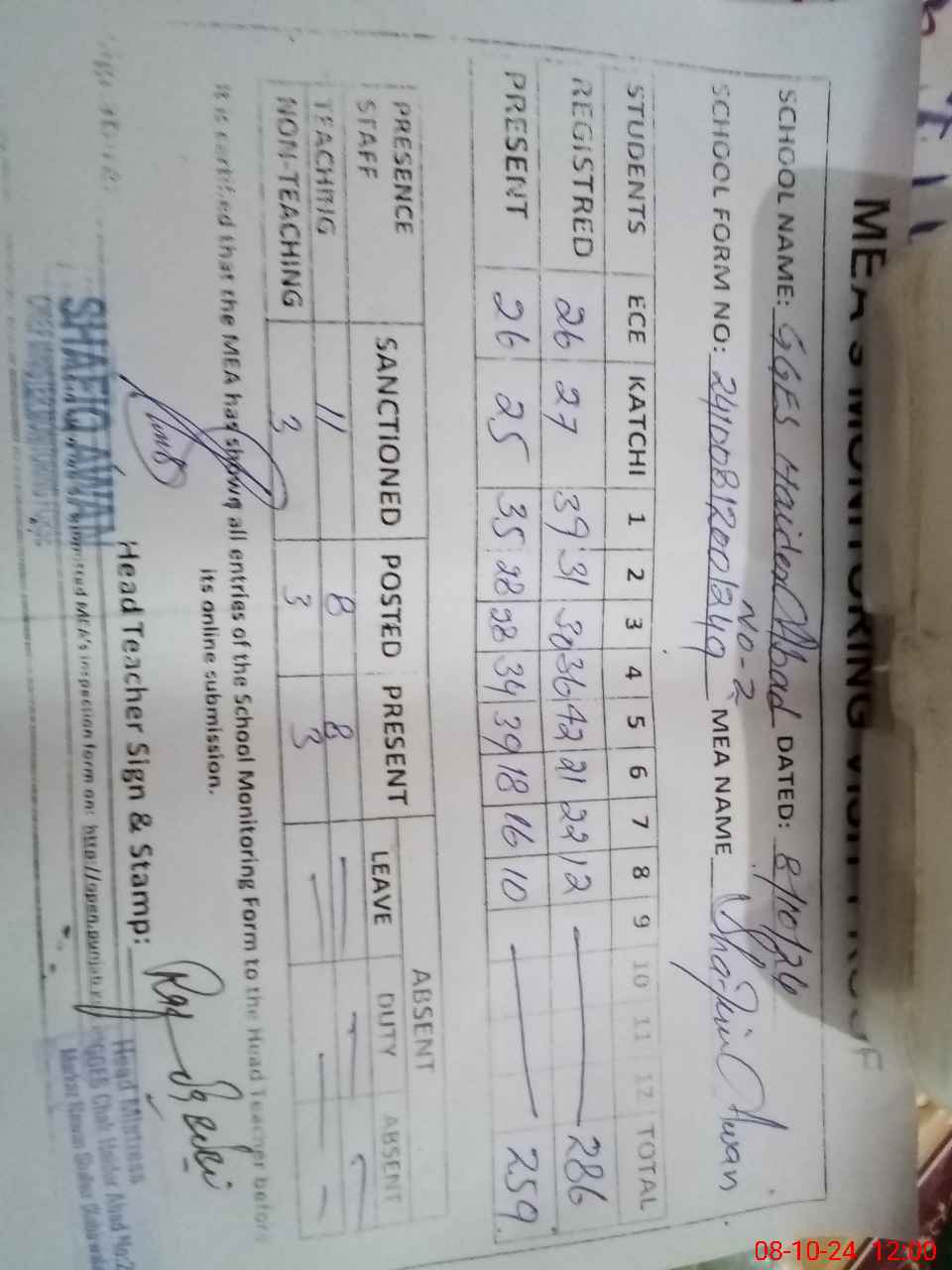 | Attendance Register | Head Teacher | MEA with School | Visit Proof |