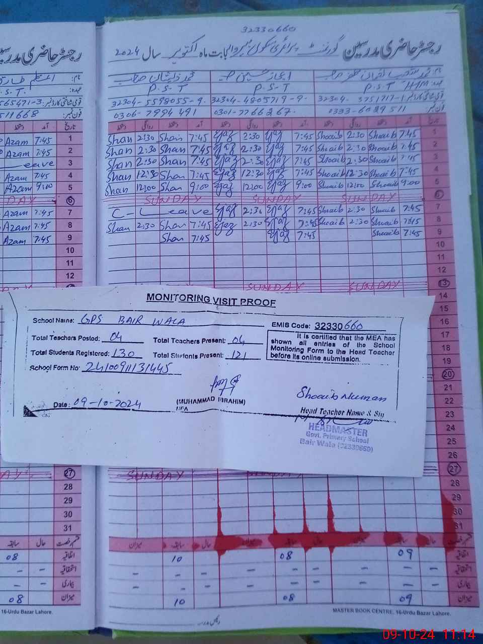 | Attendance Register | Head Teacher | MEA with School | Visit Proof |