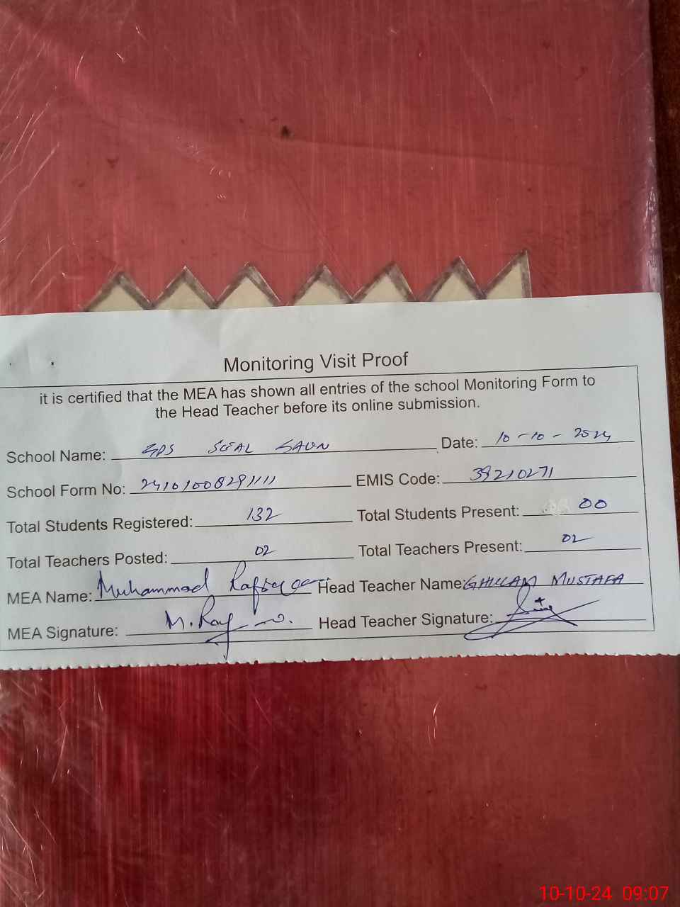 | Attendance Register | Head Teacher | MEA with School | Visit Proof |