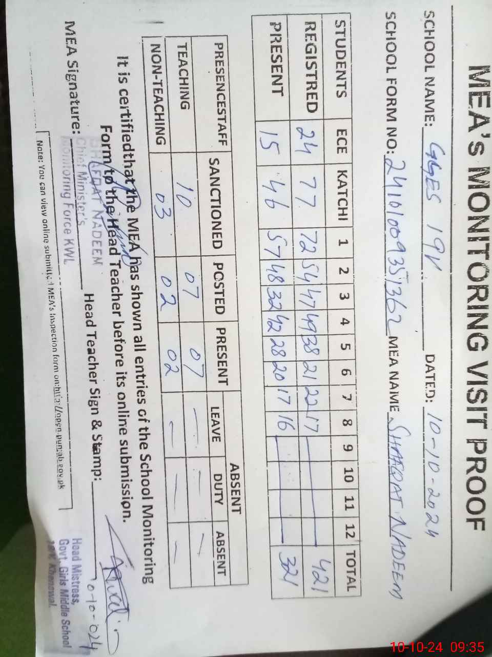 | Certified that this School was Inspected by the Undersigned MEA/DMO Today and the Information Stated Above is as Per Record. | |||||