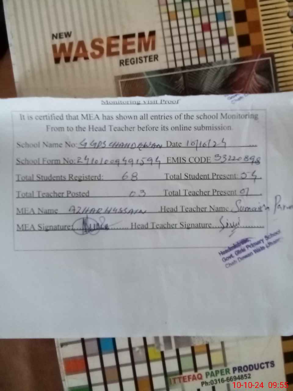 | Attendance Register | Head Teacher | MEA with School | Visit Proof |