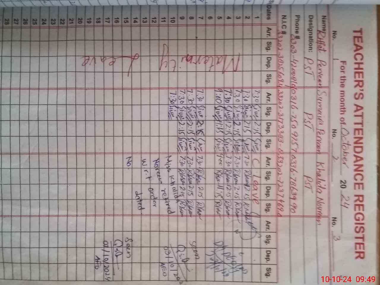 | Name: RI**** PE**** Designation: (School Headmaster's/Headmistress's) PST Phone/Cell Number: 03**** |