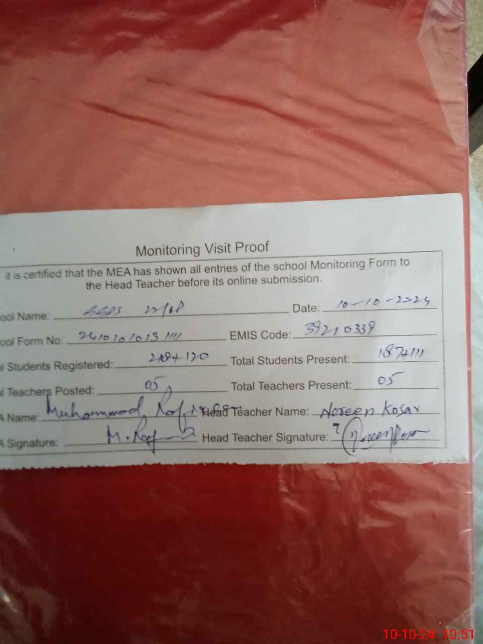| Certified that this School was Inspected by the Undersigned MEA/DMO Today and the Information Stated Above is as Per Record. | |||||
