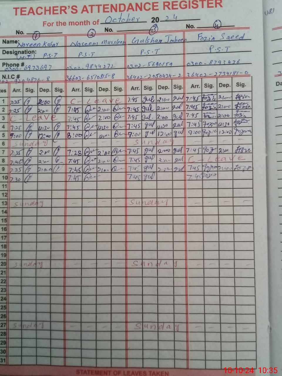| CNIC | Full Name | Designation | R/C | Absence During Last Calender Month |