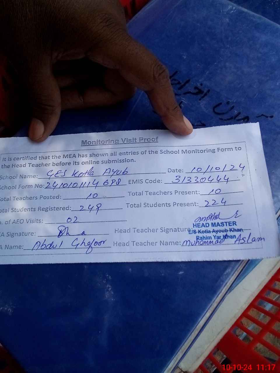 | Attendance Register | Head Teacher | MEA with School | Visit Proof |
