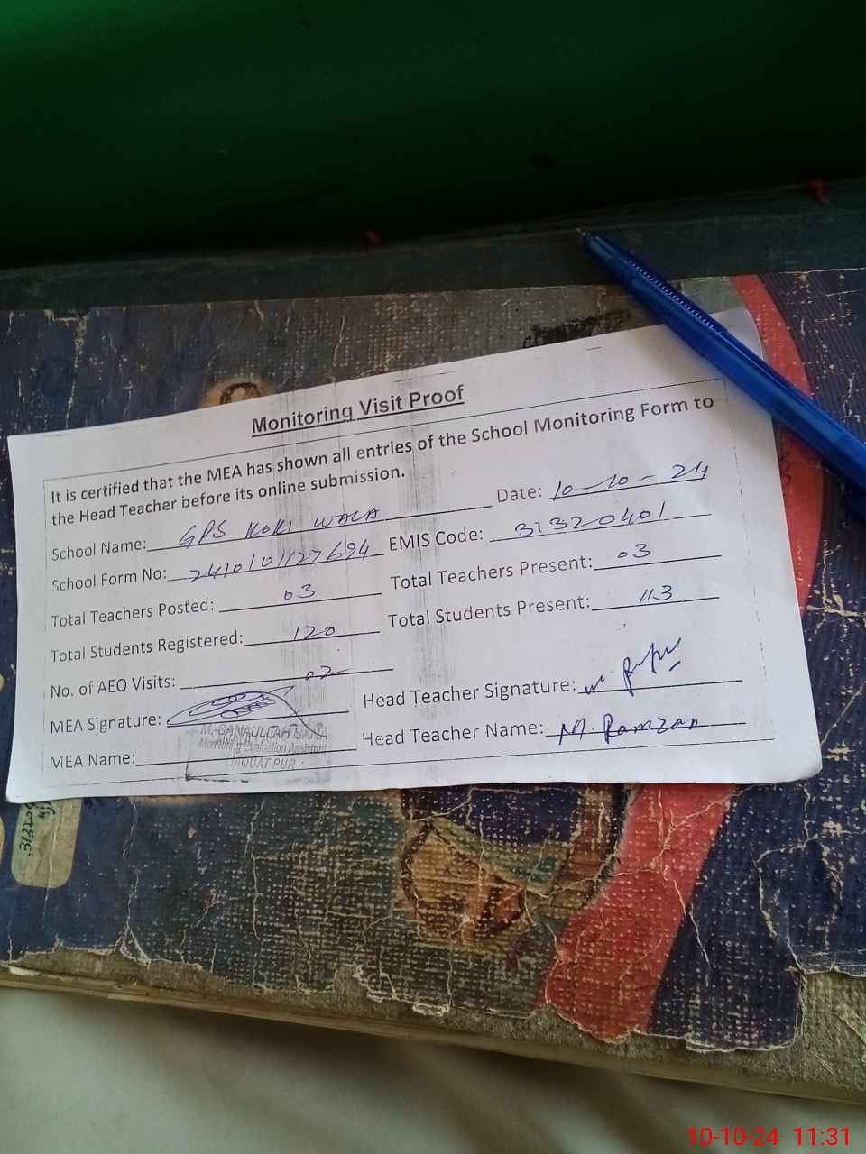 | Monitoring Date: 10-10-2024 | Start Time: 10-10-2024 11:15 AM | End Time: 10-10-2024 11:32 AM | Name of MEA: Mu**** Sa**** Ul**** Sa**** | |