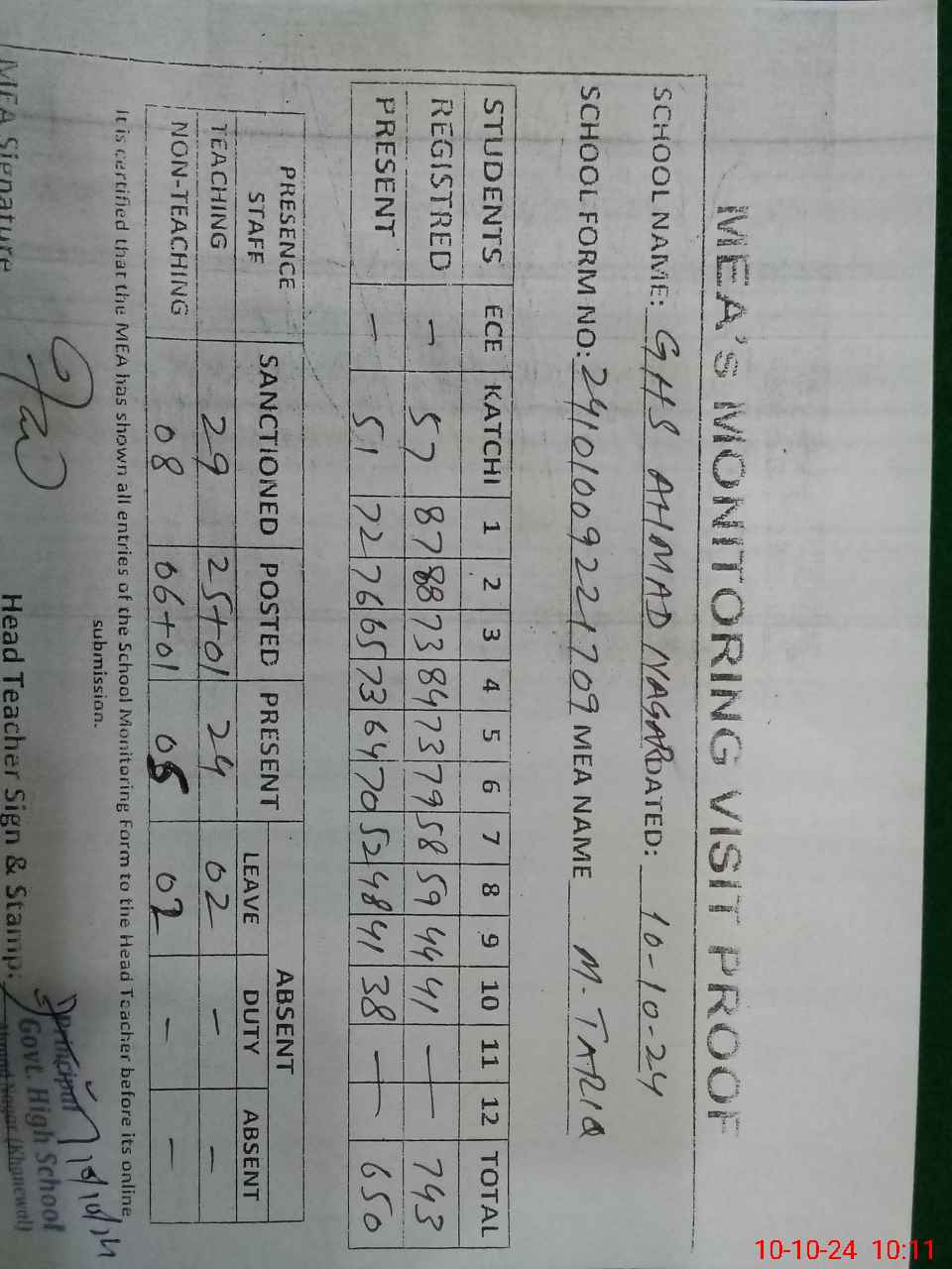 | Attendance Register | Head Teacher | MEA with School | Visit Proof |
