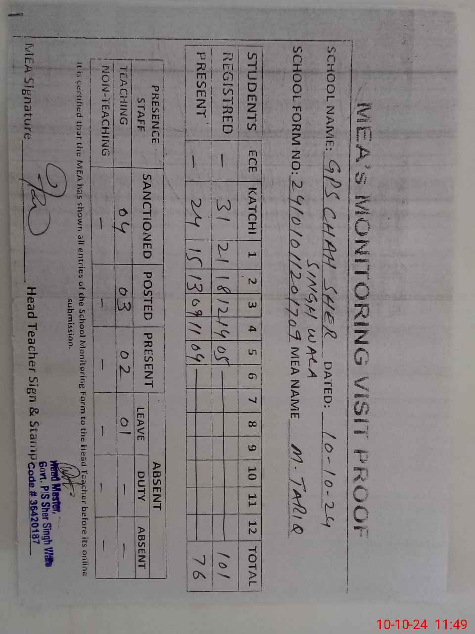 | Attendance Register | Head Teacher | MEA with School | Visit Proof |
