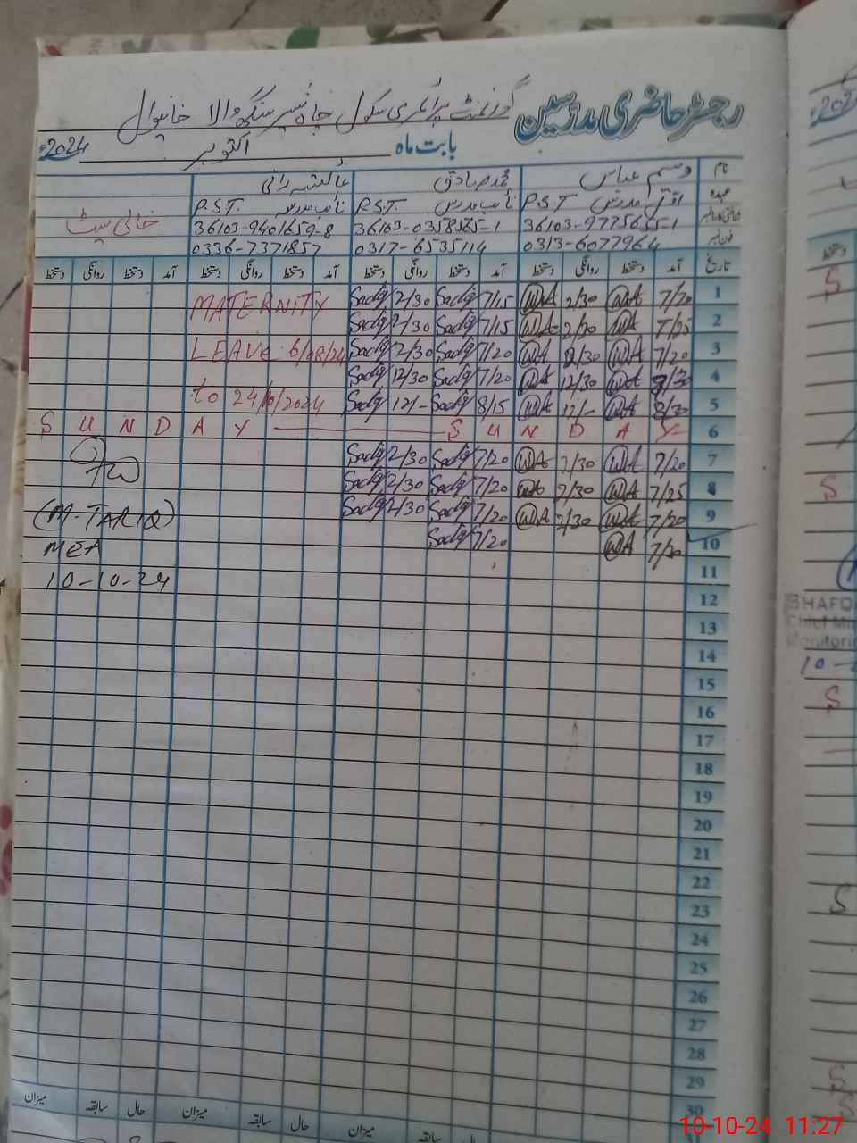 | 36**** | Ai**** Ra**** | PST | Regular | 0 | 0 | 0 | 0 | 0 | 0 | 0 | 0 | 0 | Maternity |