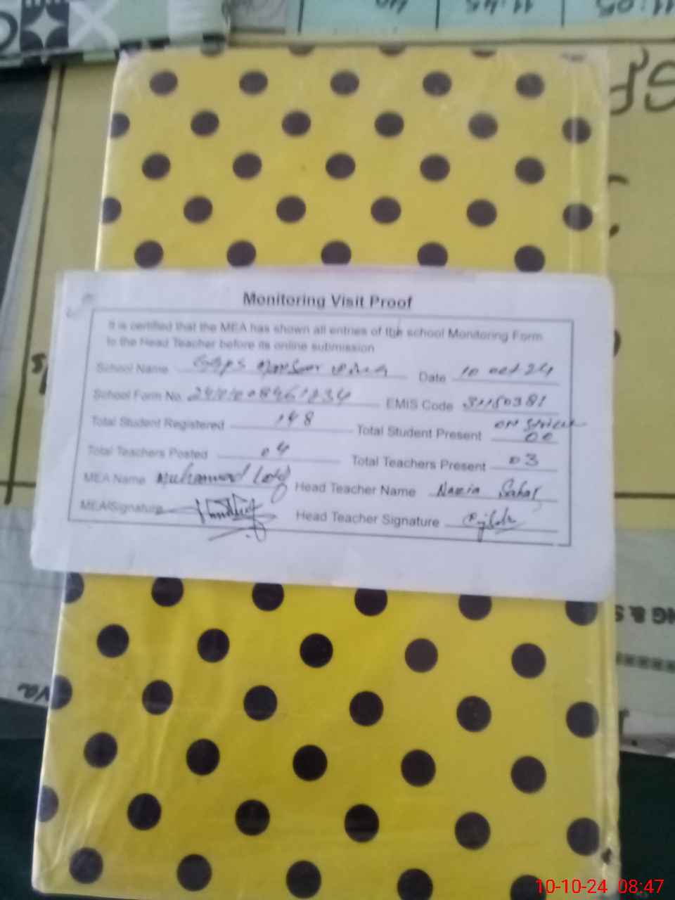 | Attendance Register | Head Teacher | MEA with School | Visit Proof |