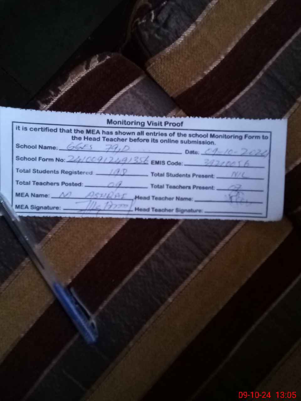| Attendance Register | Head Teacher | MEA with School | Visit Proof |
