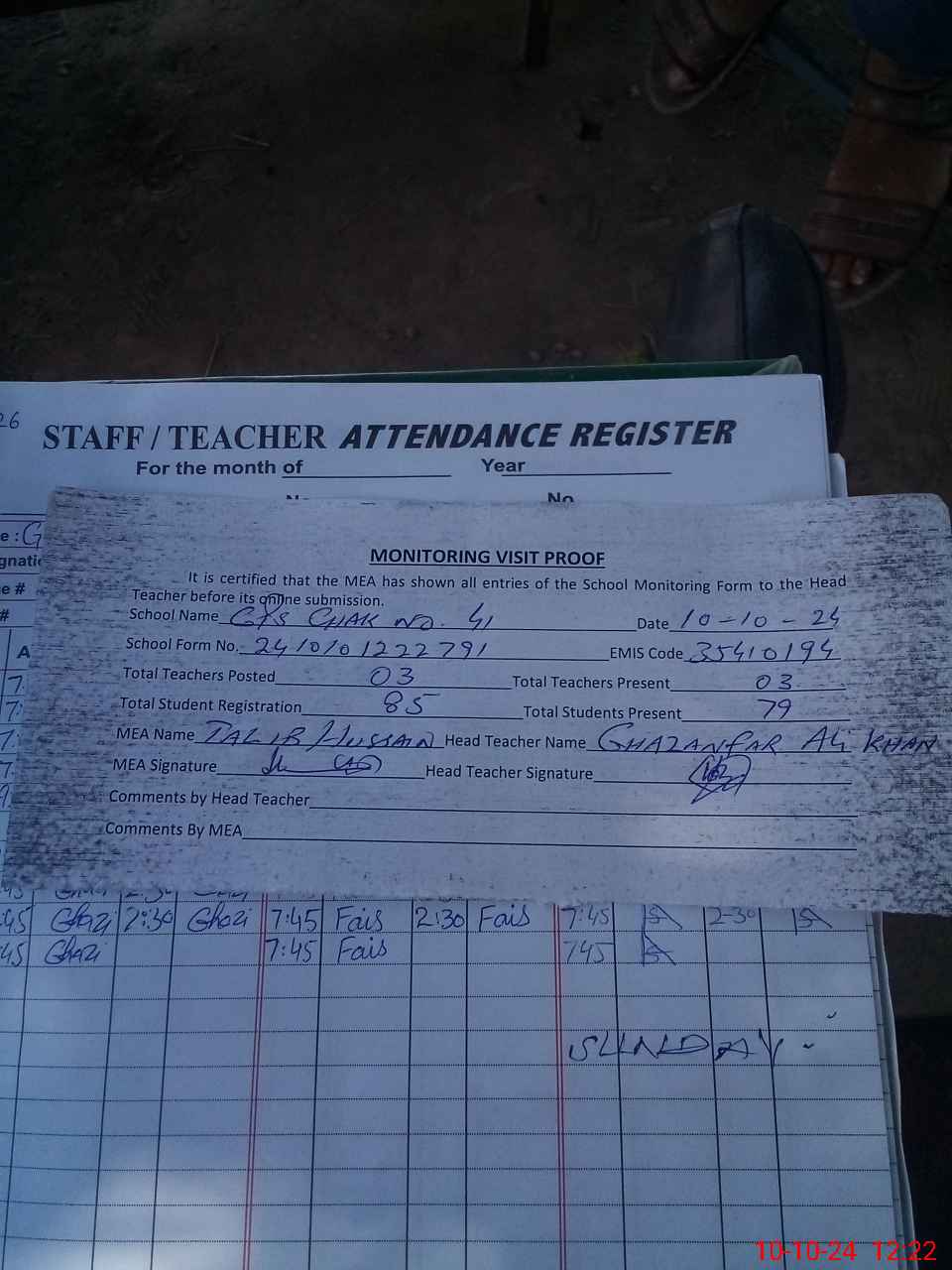 | Attendance Register | Head Teacher | MEA with School | Visit Proof |