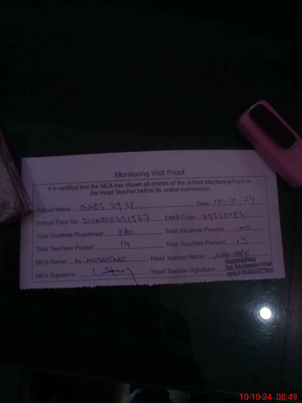 | Attendance Register | Head Teacher | MEA with School | Visit Proof |