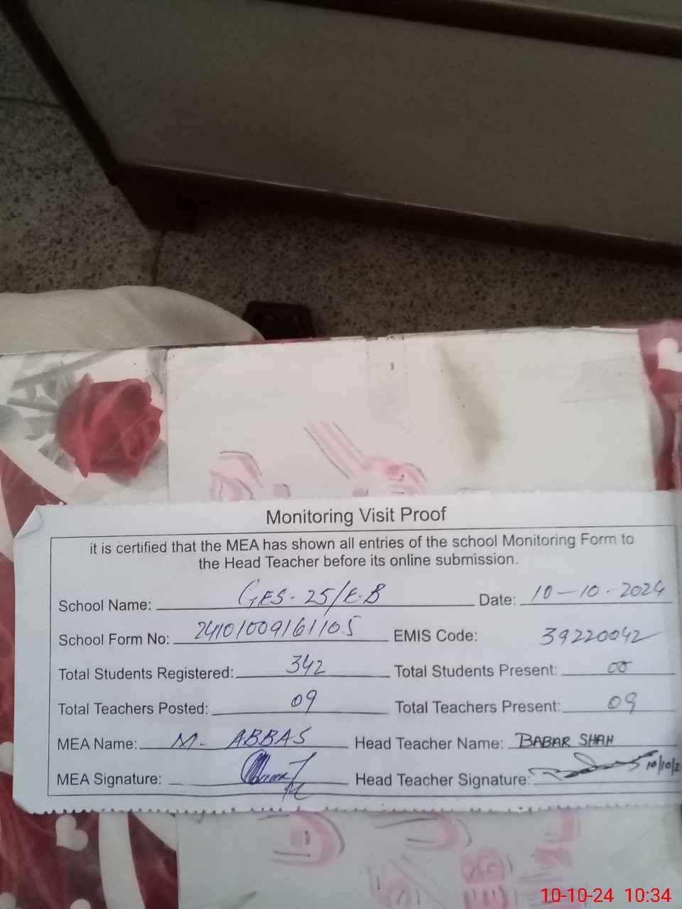 | Certified that this School was Inspected by the Undersigned MEA/DMO Today and the Information Stated Above is as Per Record. | |||||