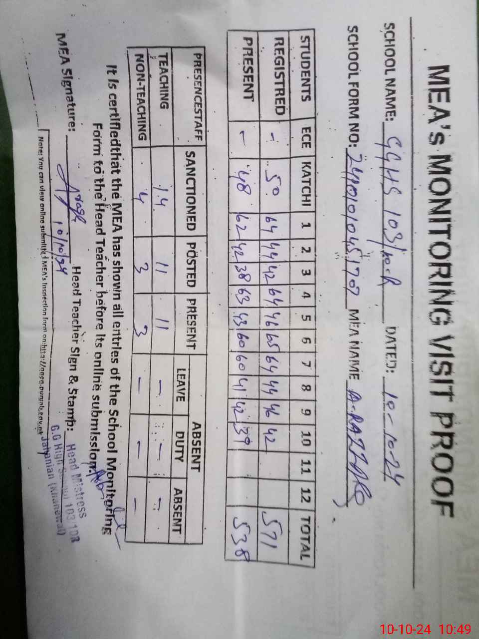 | Attendance Register | Head Teacher | MEA with School | Visit Proof |