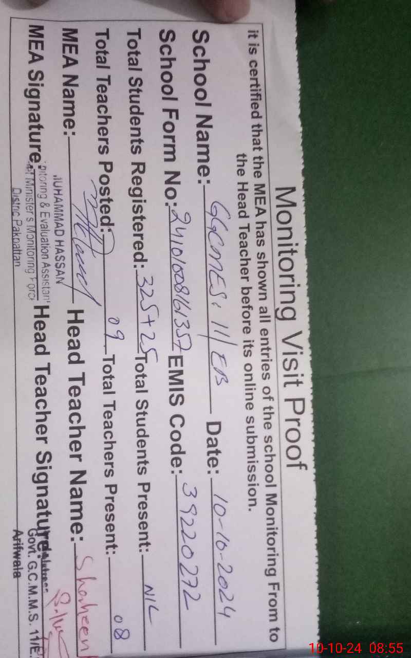 | EMIS Code: 39220272 | Name of School: GGCMES 11 EB P/O PIR SADAR DIN | |||