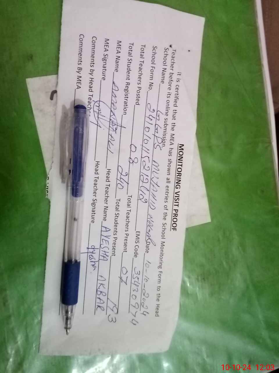 | Attendance Register | Head Teacher | MEA with School | Visit Proof |
