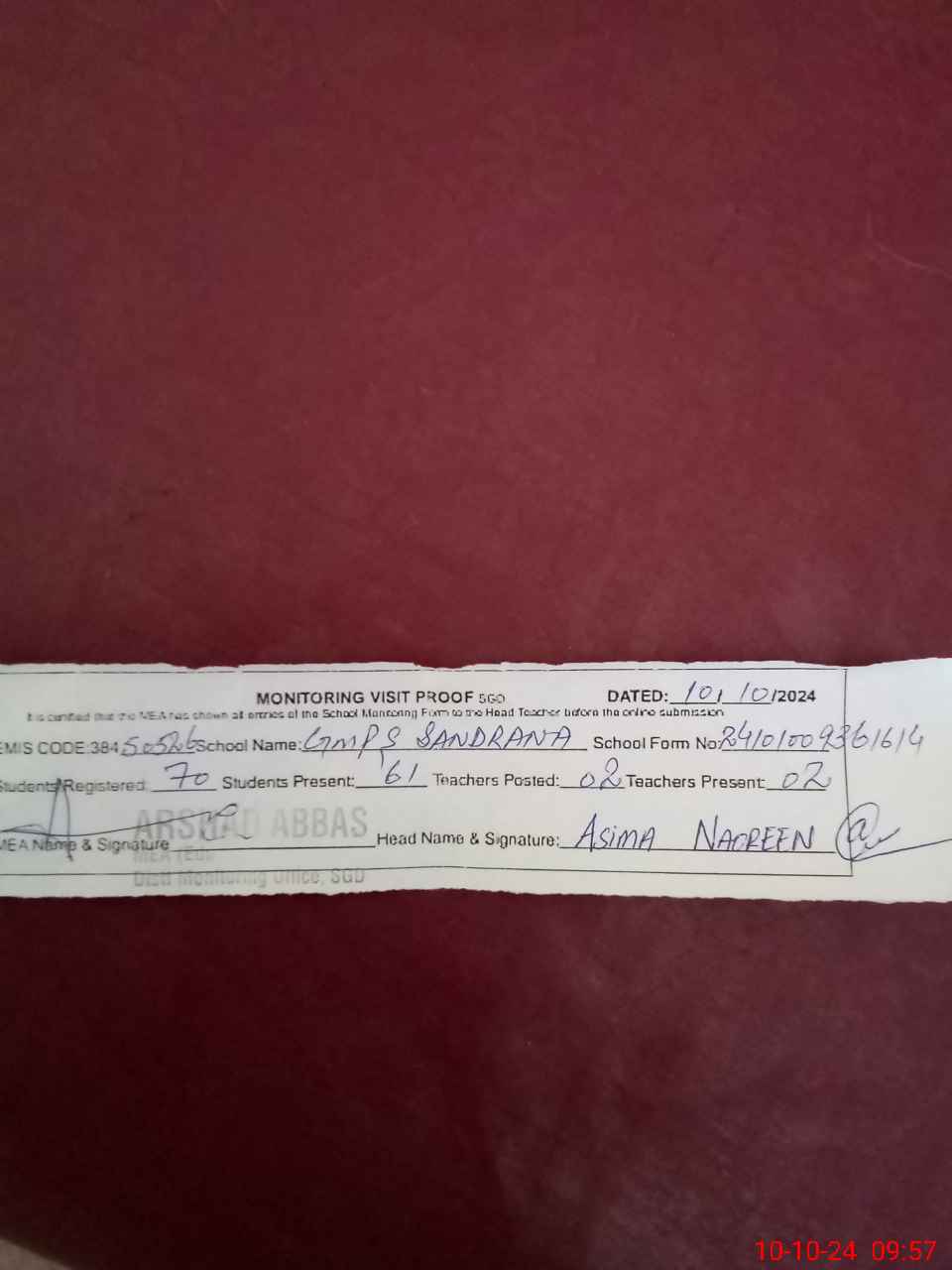 | Attendance Register | Head Teacher | MEA with School | Visit Proof |