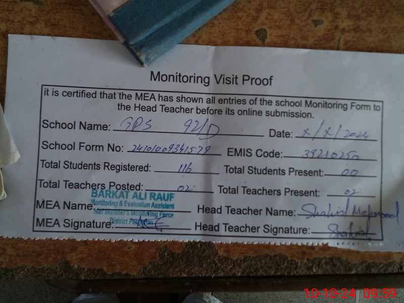 | EMIS Code: 39210250 | Name of School: GPS CHAK NO. 92 D | |||