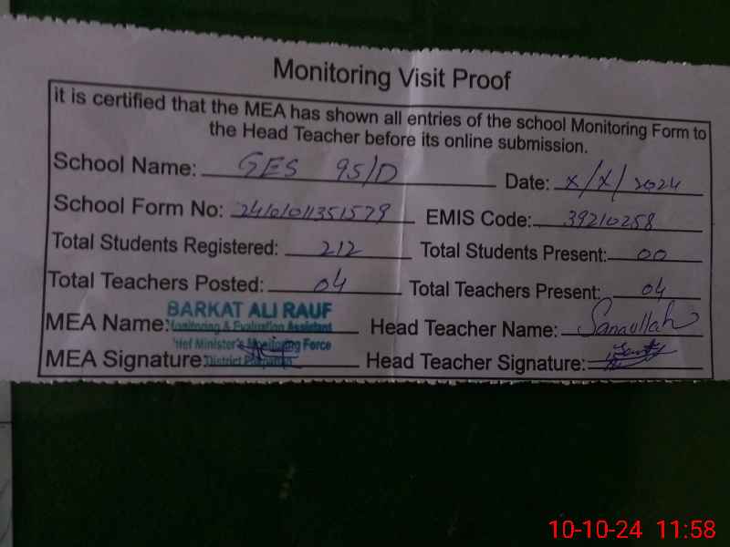 | EMIS Code: 39210258 | Name of School: GES CHAK NO. 95 /D | |||