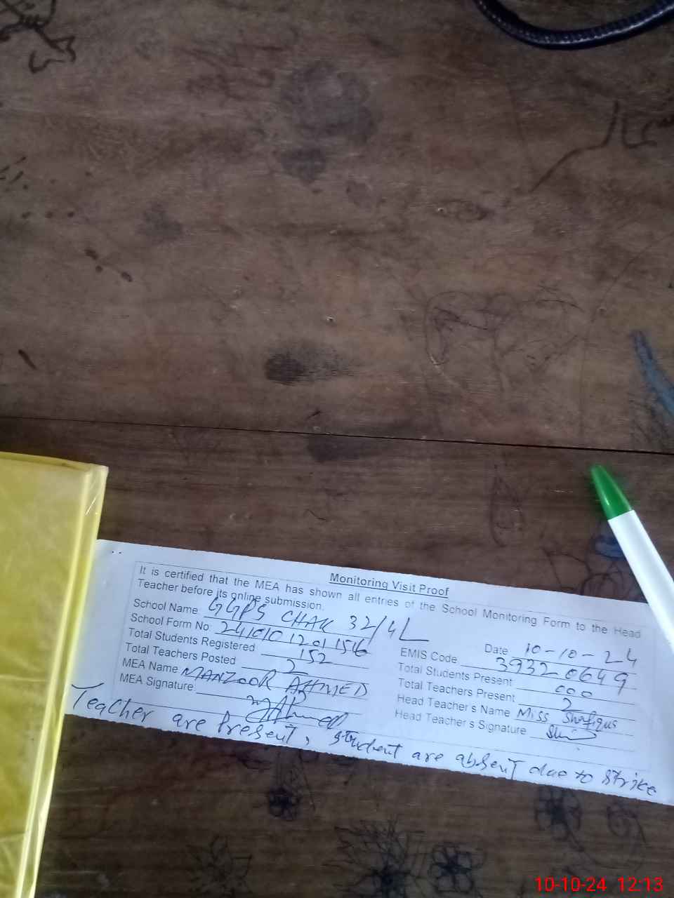 | Attendance Register | Head Teacher | MEA with School | Visit Proof |