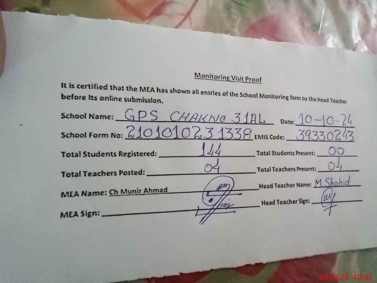 | EMIS Code: 39330243 | Name of School: GPS CHAK 3/1-AL | |||