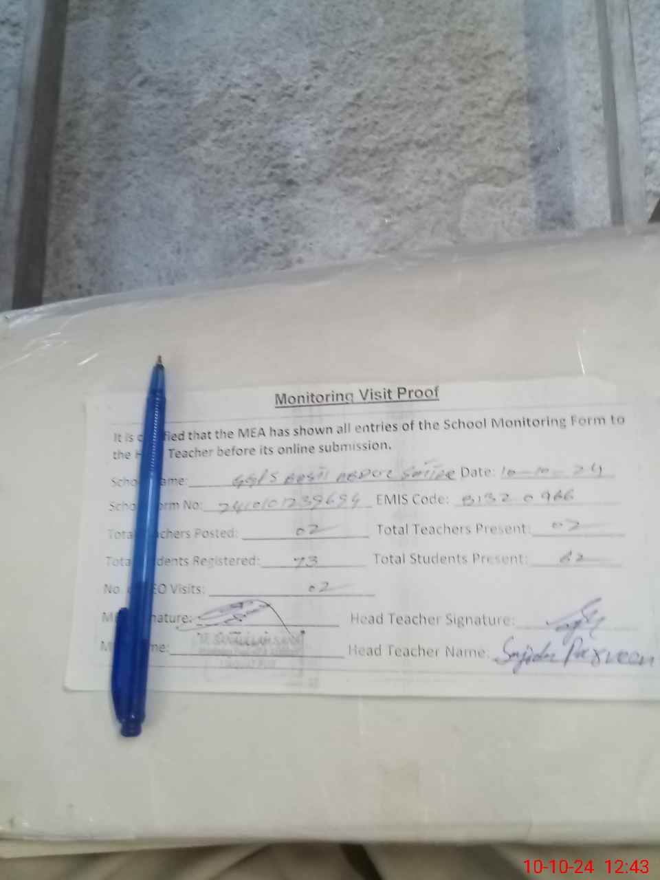 | Attendance Register | Head Teacher | MEA with School | Visit Proof |