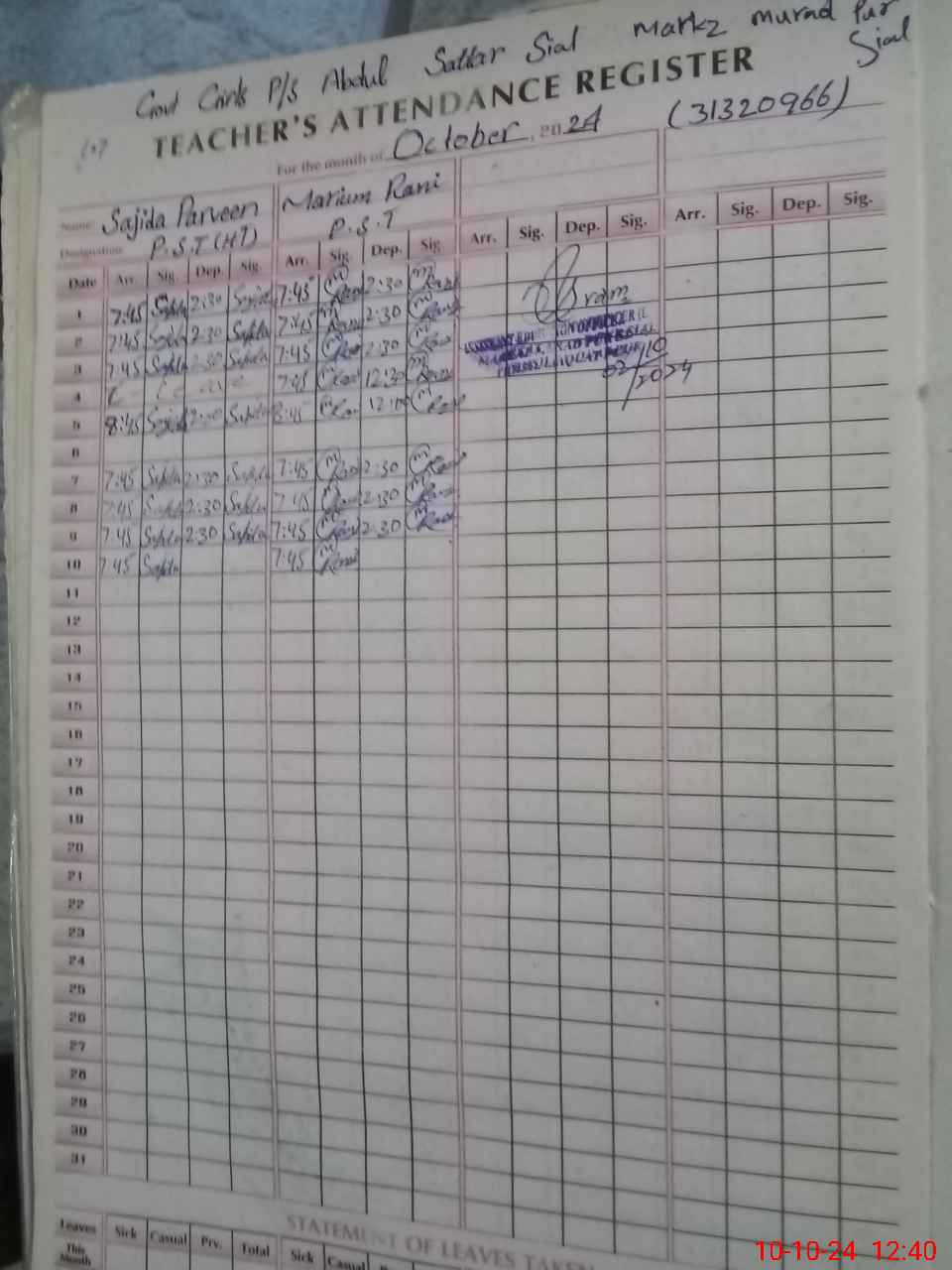 | Monitoring Date: 10-10-2024 | Start Time: 10-10-2024 12:23 PM | End Time: 10-10-2024 12:44 PM | Name of MEA: Mu**** Sa**** Ul**** Sa**** | |