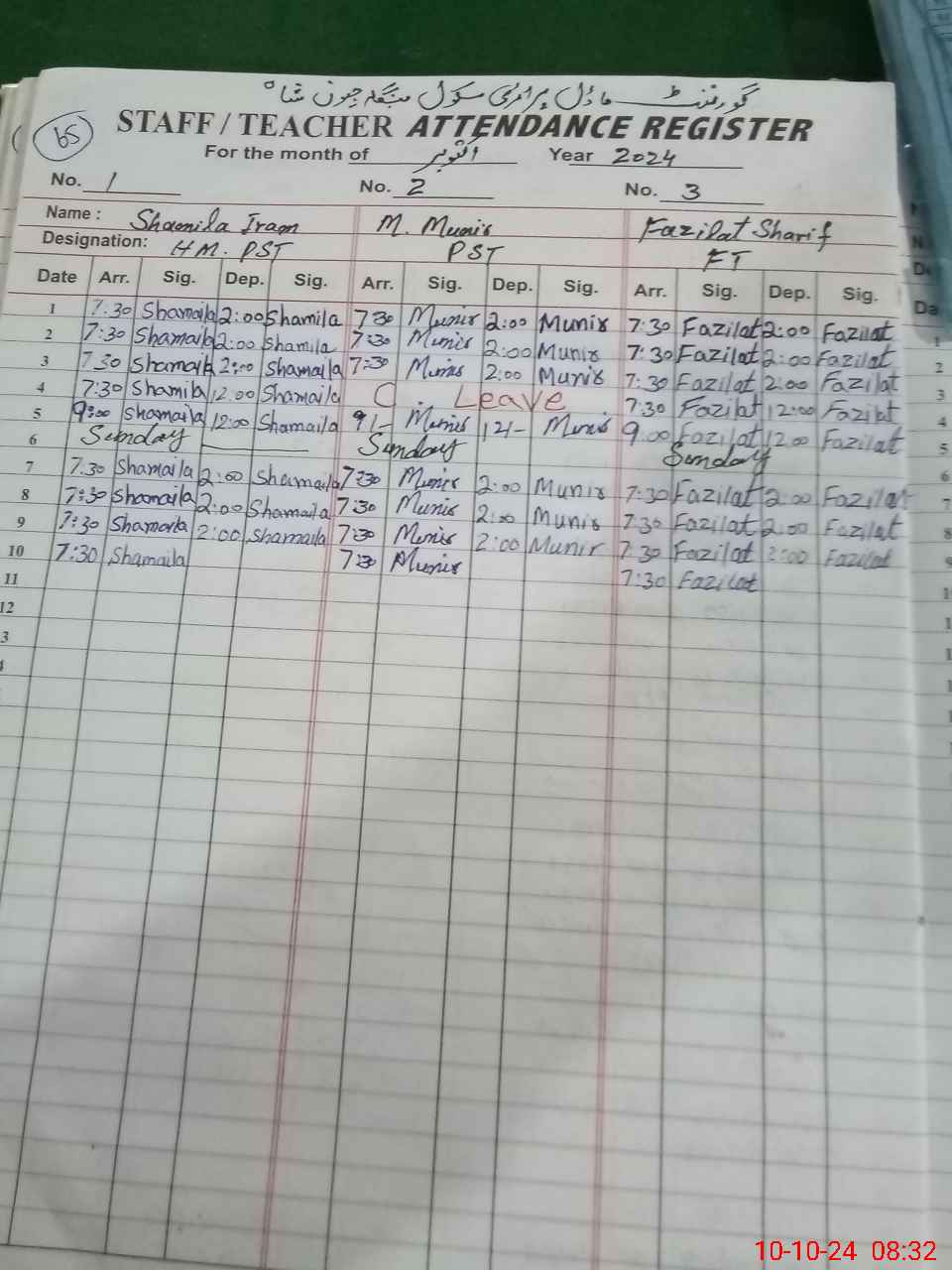 | Name: SH**** IR**** Designation: (School Headmaster's/Headmistress's) PST Phone/Cell Number: 03**** |