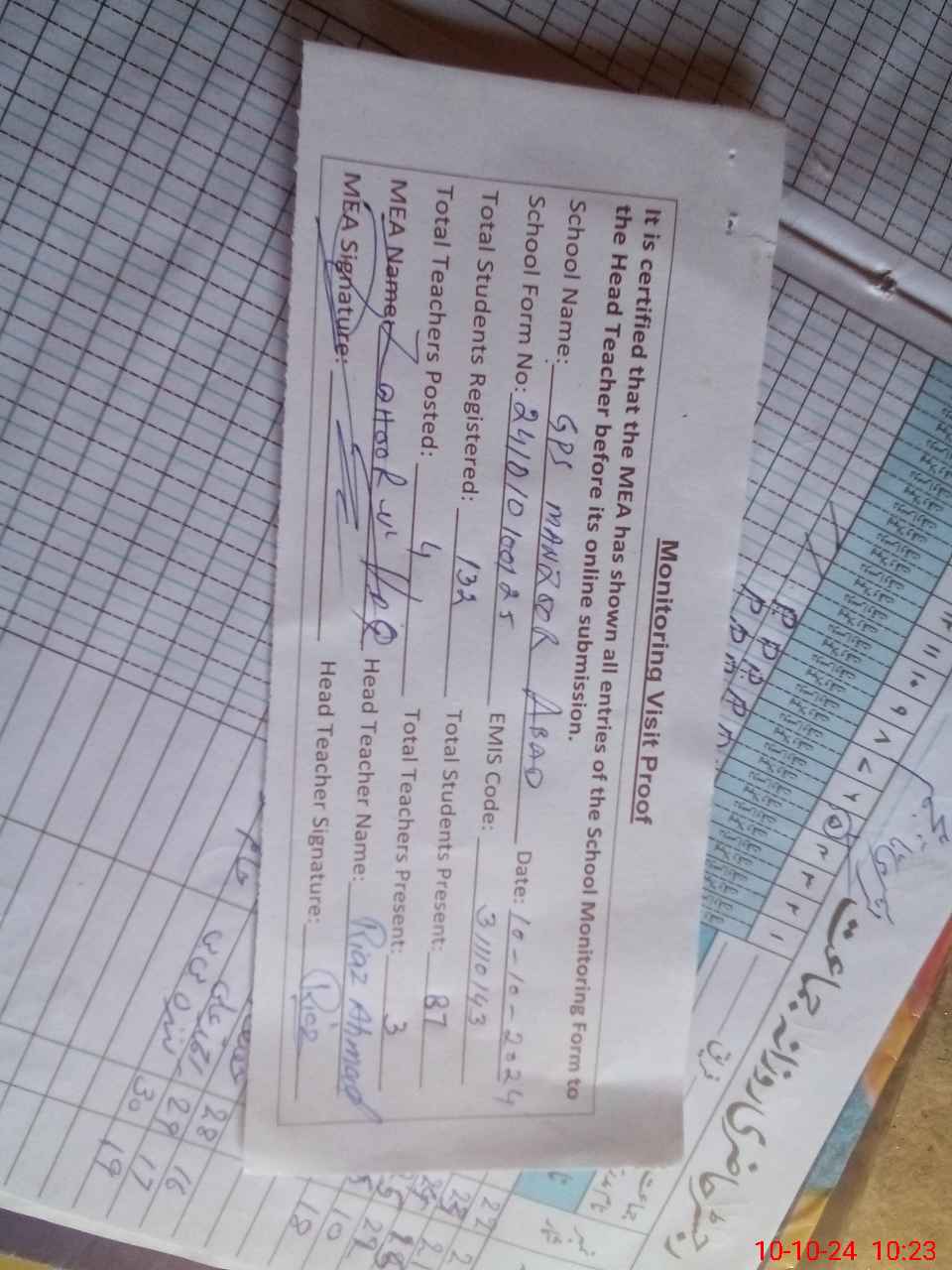 | Certified that this School was Inspected by the Undersigned MEA/DMO Today and the Information Stated Above is as Per Record. | |||||