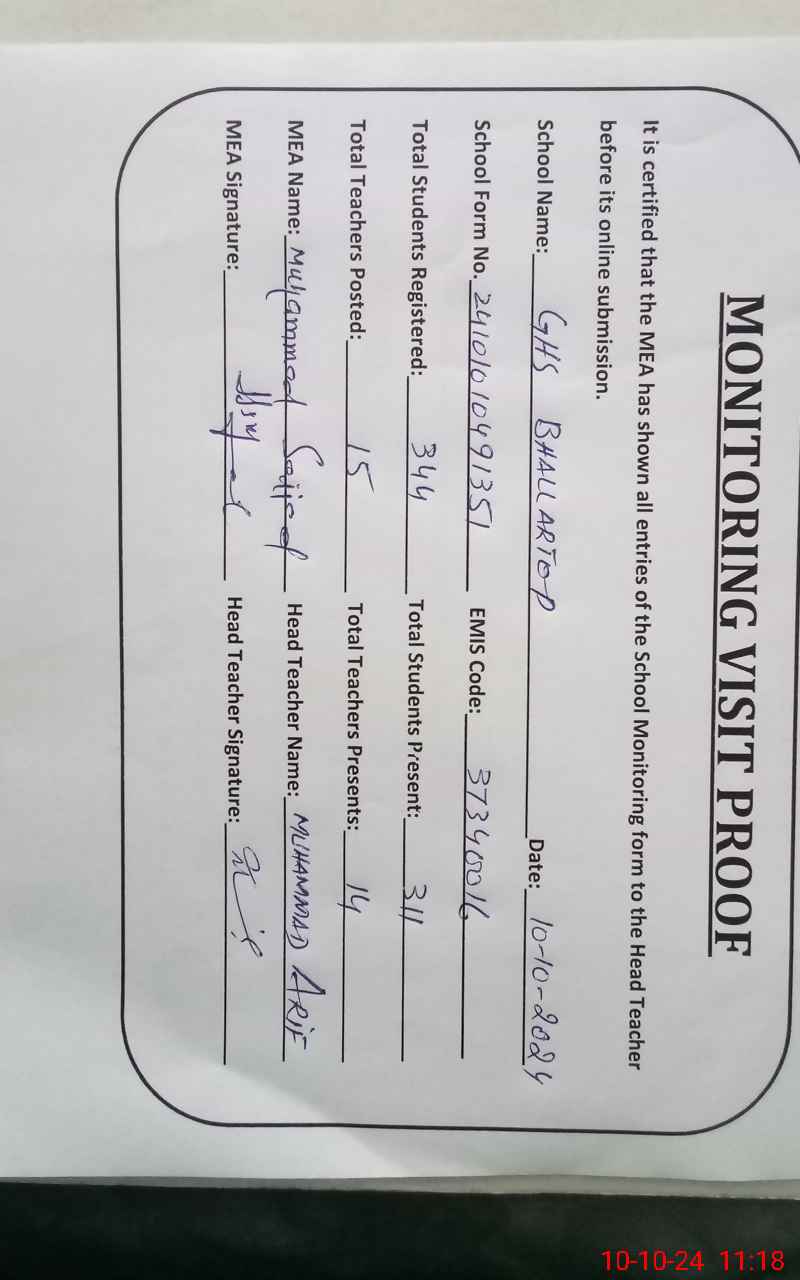 | EMIS Code: 37340016 | Name of School: GHS BHALLARTOP | |||