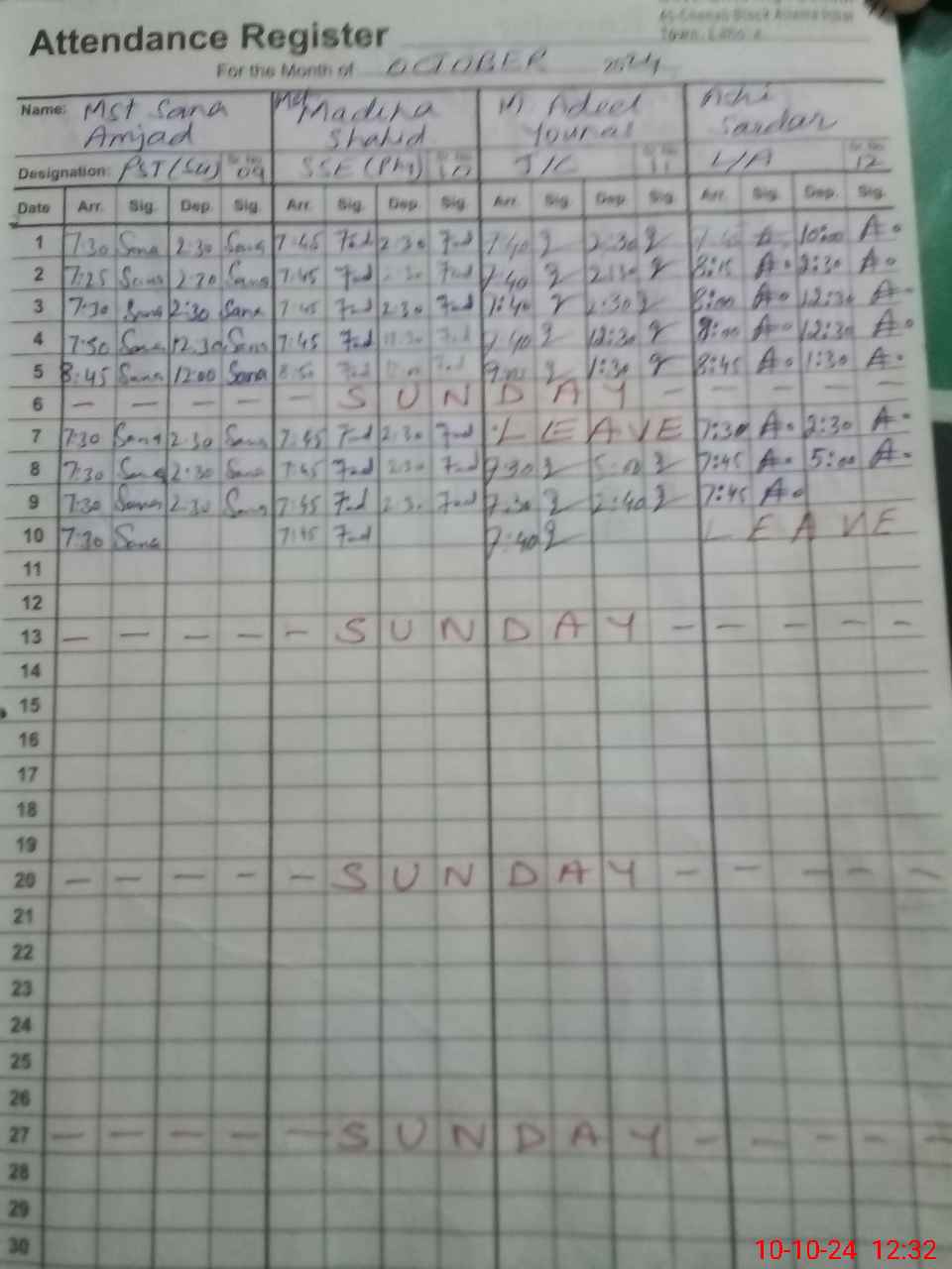 | CNIC | Full Name | Designation | R/C | Absence During Last Calender Month |