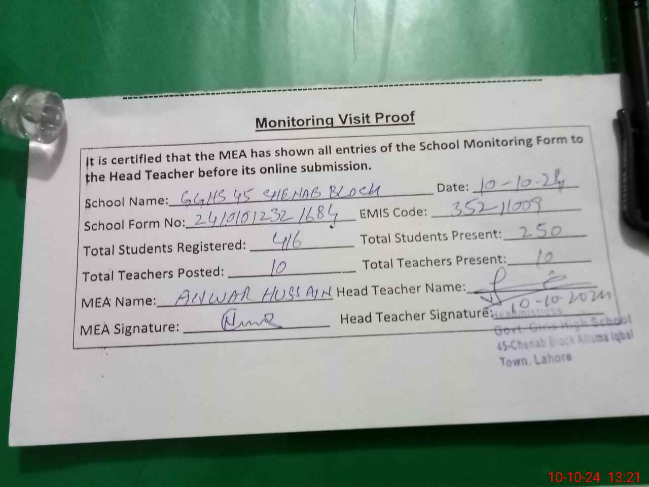 | EMIS Code: 35211009 | Name of School: GGHS 45- CHENAB BLOCK ALLAMA IQBAL TOWN | |||