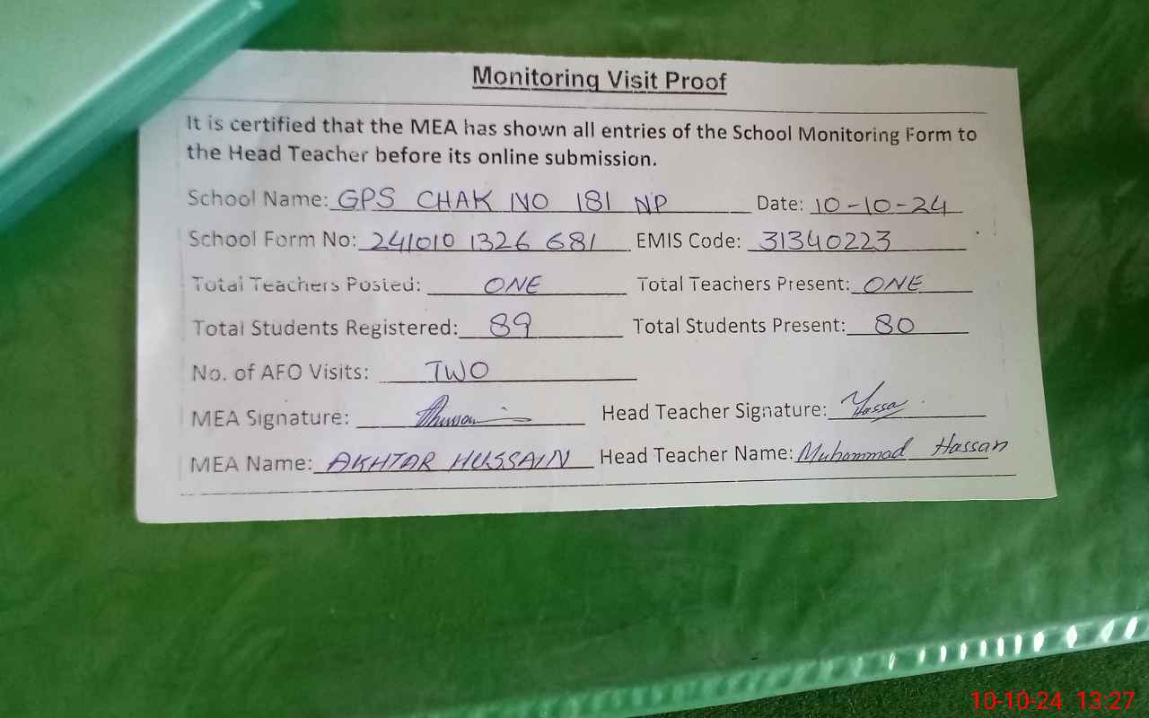 | EMIS Code: 31340223 | Name of School: GPS CHAK NO 181 NP | |||